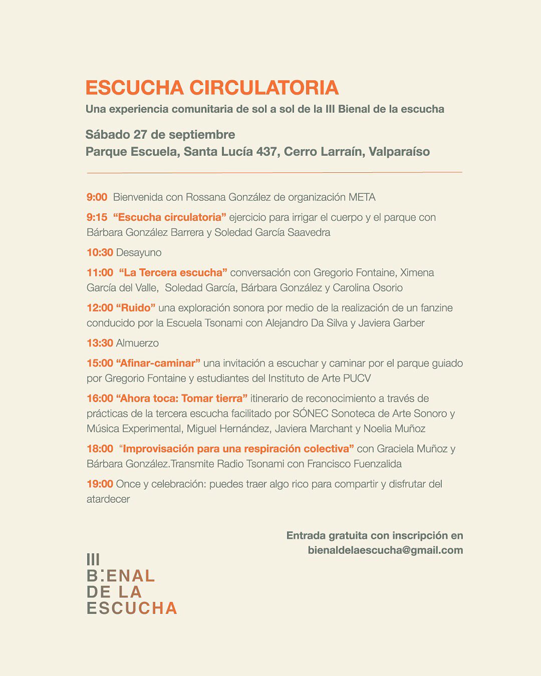 El programa consiste en ejercicios, conversatorios, talleres e improvisaciones sonoras colectivas al interior del Parque que serán facilitadas por las curadoras y los equipos de TSONAMI, Alejandro Da Silva y Javiera Garber, la transmisión de Radio Tsonami; SÓNEC Sonoteca, Miguel Hernández y Noelia Muñoz; Laboratorio del Eco, Gregorio Fontén y estudiantes del Instituto de Arte de la Pontificia Universidad Católica de Valparaíso. Además contaremos con la compositora Graciela Muñoz una de las artistas invitadas a la Tercera Bienal.