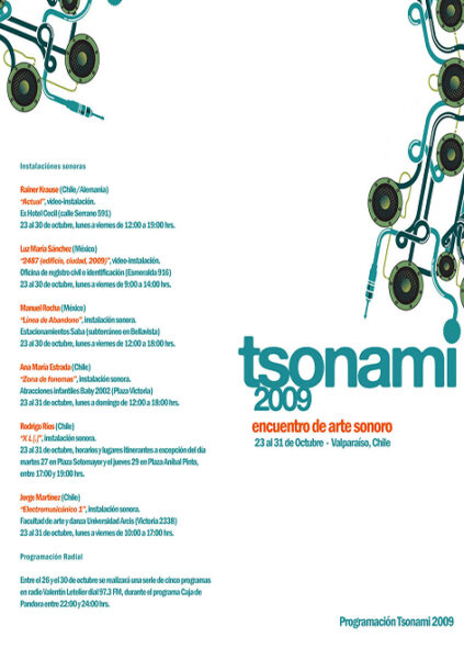 Tsonami (2009)Comunidad GráficaAna María EstradaJorge MartínezLuz María SanchezManuel RochaRainer KrauseRodrigo RíosReconocimiento-NoComercial-SinObraDerivada ( CC BY-NC-ND)Documento PDFEspañol AficheArte SonoroMúsica ExperimentalDonación Afiche Tsonami 2009Tsonami 2009Ver más... Proyecto Sónec | Ago 16, 2023